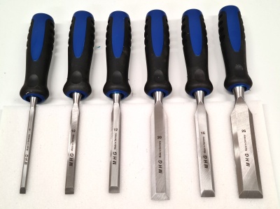 Firmer chisels - set in neutral carton box, 2-part-comp. plastic handle without impact button, polished blade, 9 pcs. sizes: 6, 8, 10, 12, 14, 16, 20, 26, 30 mm
