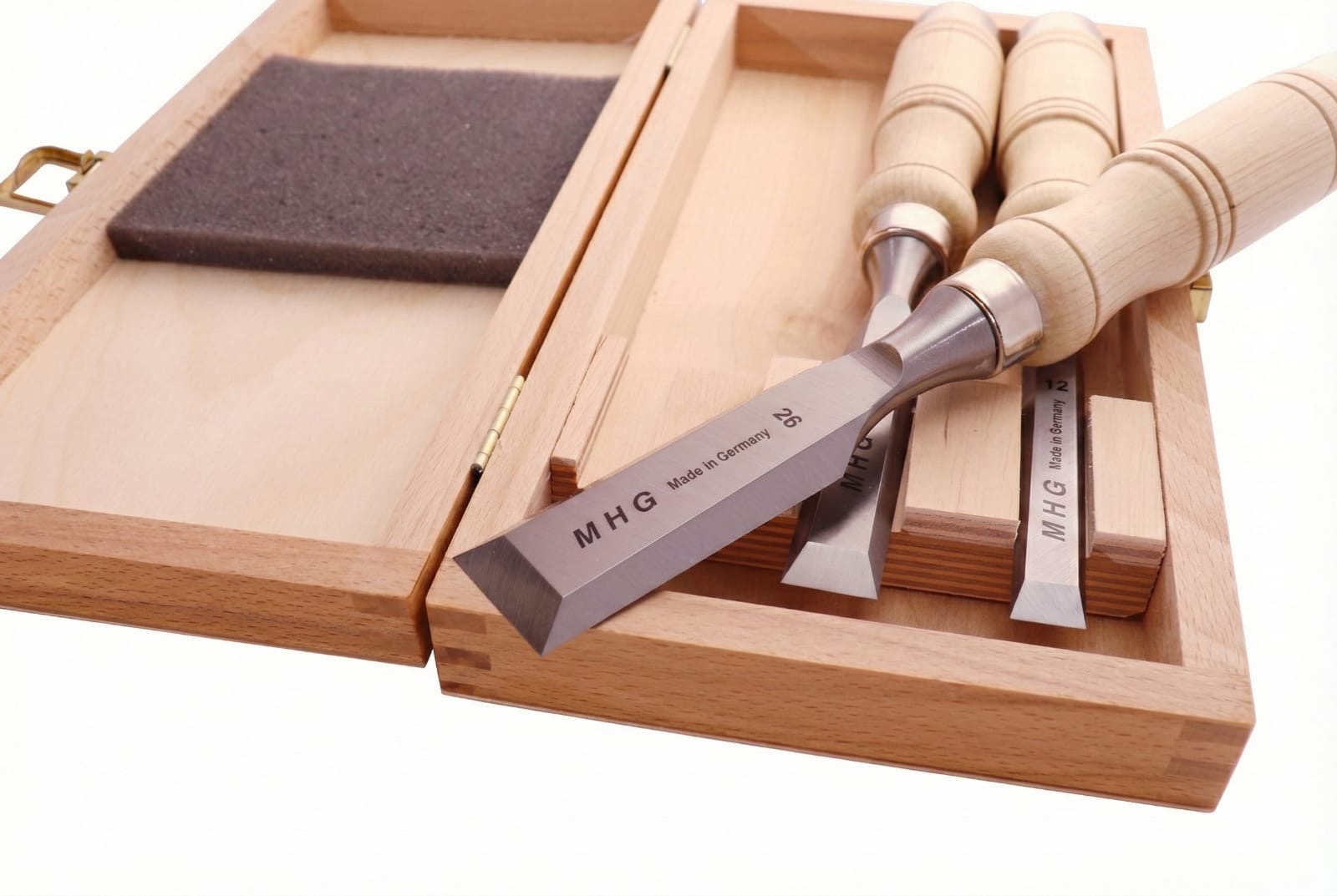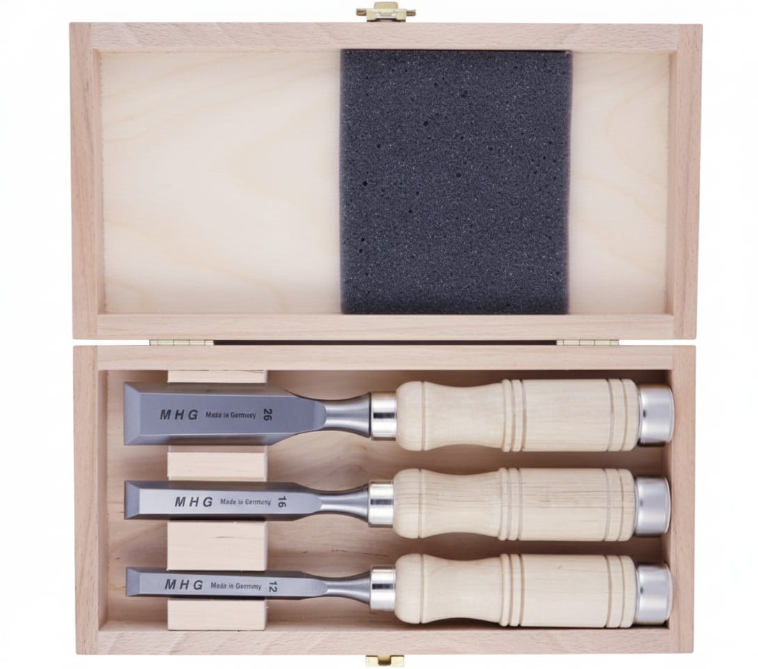 Kurzbeitelsatz 3-tlg im Holzkasten, Seitenfase bis Spiegelseite, Rundheft Weißbuche, Inhalt: 12, 16, 26 mm