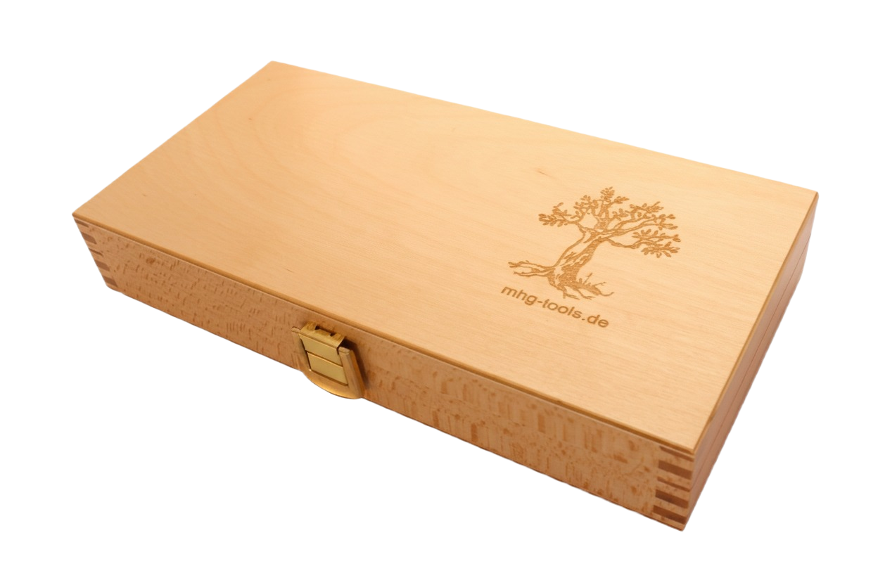 Der 3-tlg. neue Kurzbeitelsatz im hochwertigen Holzkasten ist ein ideales Werkzeug für ein exaktes Nacharbeiten von Schwalbenschwänzen und Nuten.