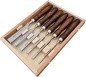 Mobile Preview: PREMIUM SLIM CHISEL with round handle ash brown, blade finely ground with side bevel up to the back 6-piece. Set in wooden box LASER MHG Contents: 6,10,12,16,20,26 mm