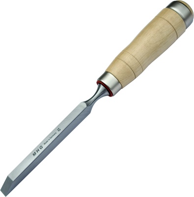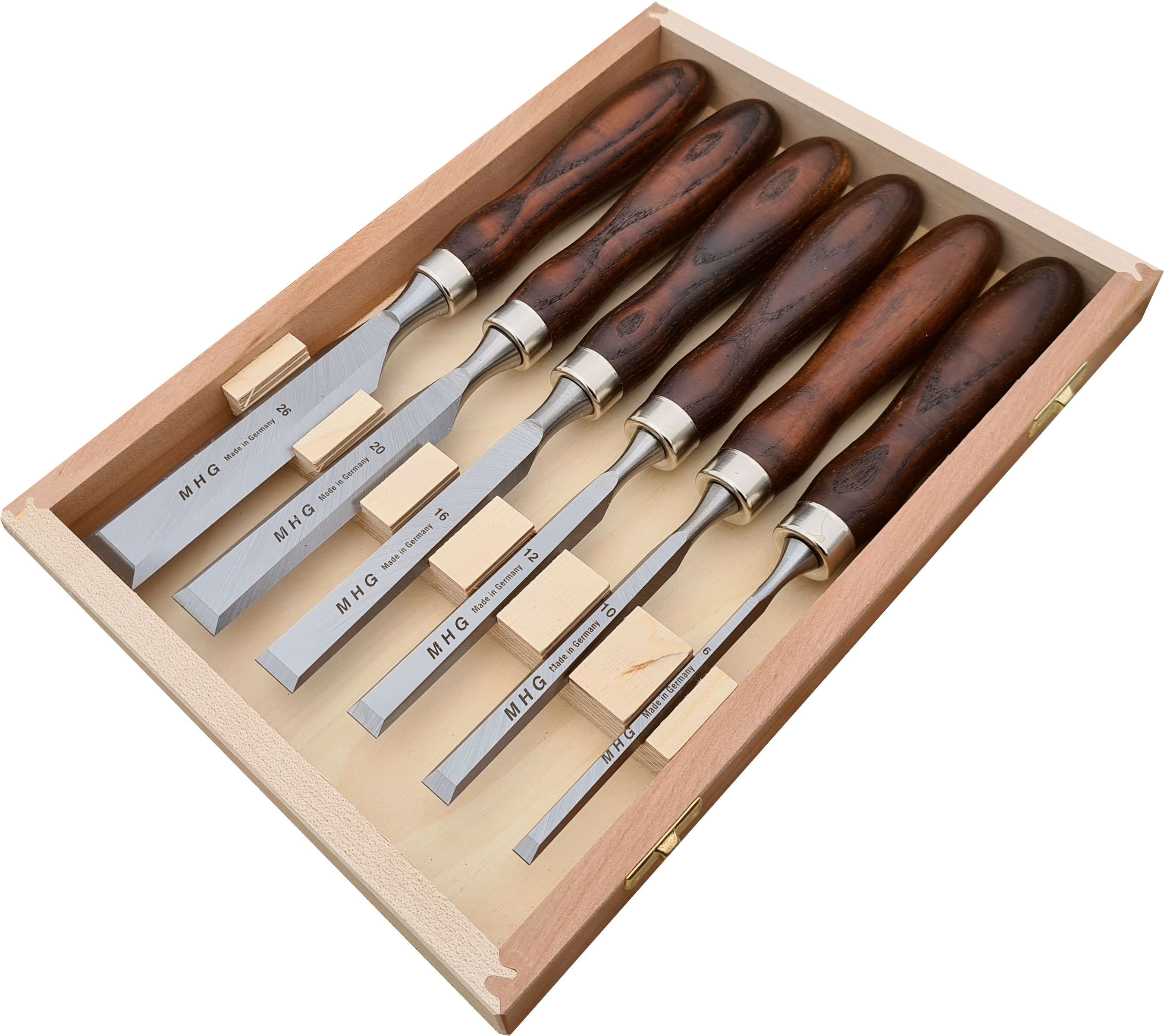 PREMIUM SLIM CHISEL with round handle ash brown, blade finely ground with side bevel up to the back 6-piece. Set in wooden box LASER MHG Contents: 6,10,12,16,20,26 mm